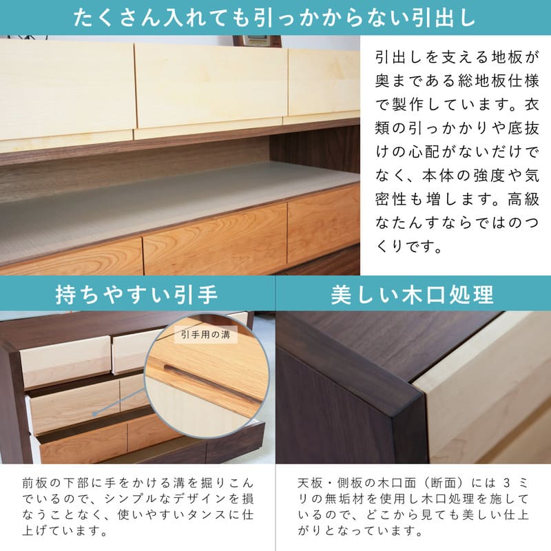 ほとんどのタンスは「上げ底」構造ですが、当社の引出しの底板は全て「ベタ底」構造となっています。ベタ底構造は引出しの開閉がスムーズで、さらに底抜けの心配がない耐久性の高い構造です。