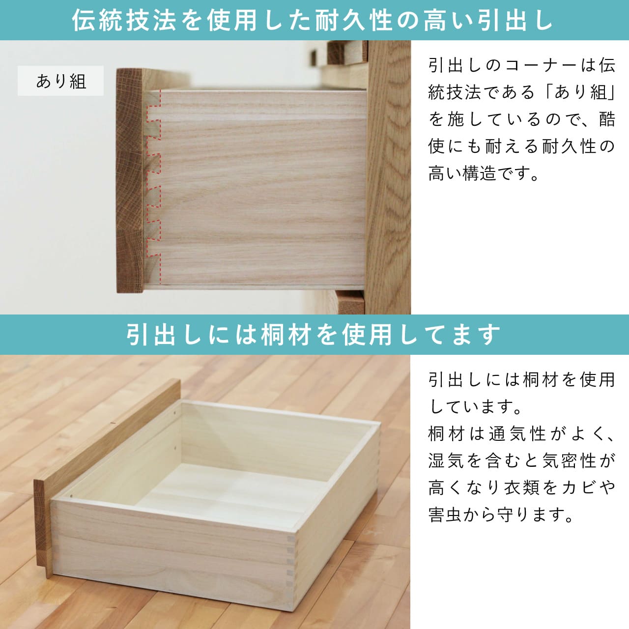 引き出しには桐材を使用しています。桐にはカビや害虫から衣類を守る効果があります。