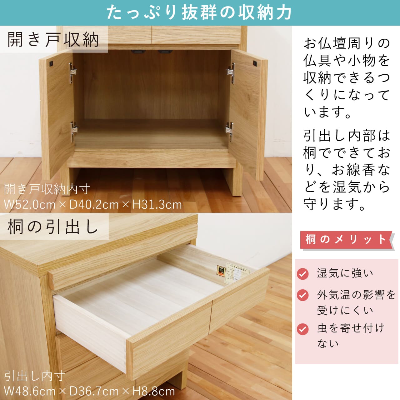 引き出しの内部には「桐」を贅沢に使用しています。