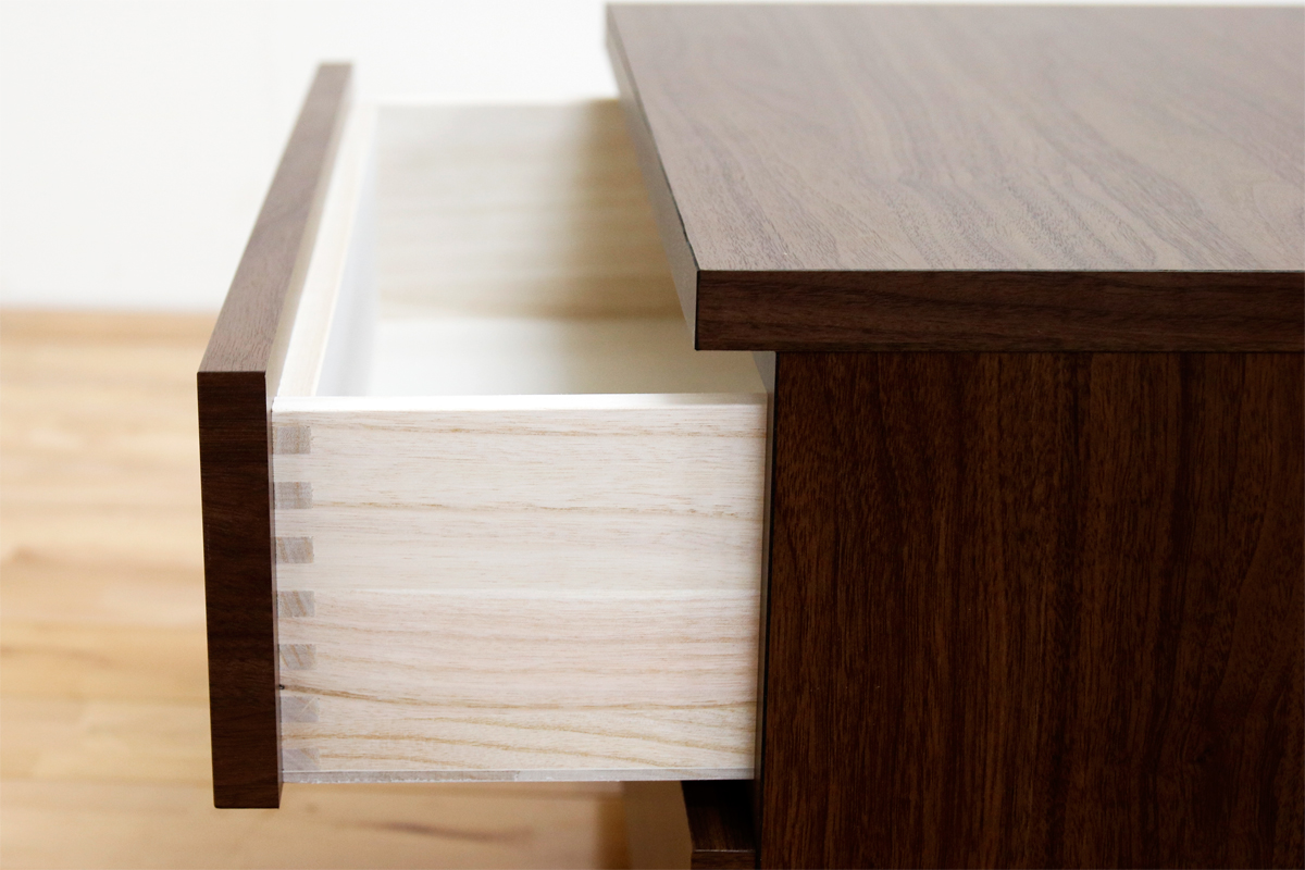 引出しの箱は伝統的な「蟻組」または「短形組(ロッキング組)」で組み上げています。こうすることで接合部の強度が高くなります。また、見た目にも美しい仕上がりとなります。